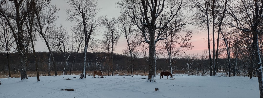 But they don’t always want it. They wander out to the pasture – wide open for the winter – and find a sunny spot to stand and doze. They snuffle and scrounge around in the snow, pawing up pieces of frozen pasture, and warm their muscles with an occasional session of horseplay – sparring back and forth, a couple of senior geldings playing stallions.
