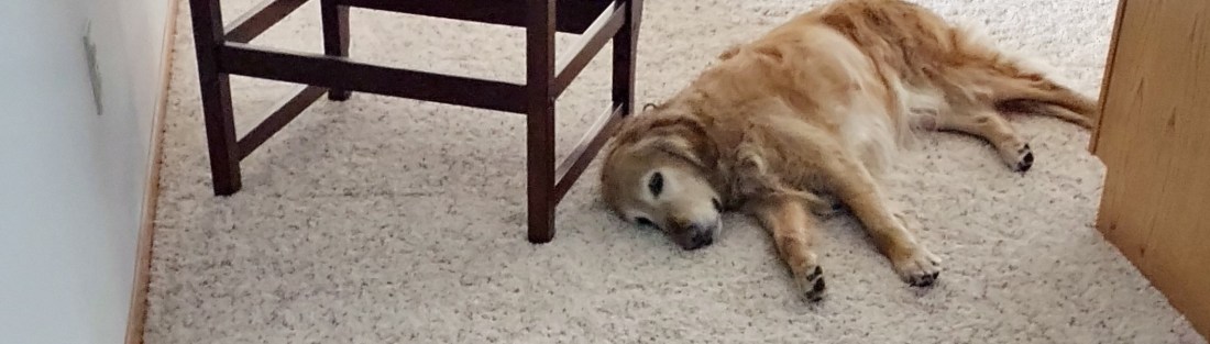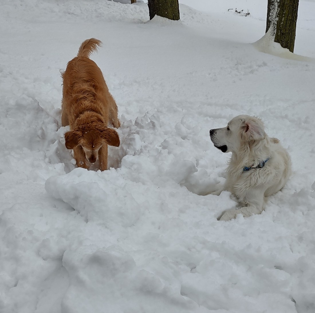 Remi is a petite, short-coated black lab who dries quickly. Ruff is a galootish, long-coated golden retriever who does not.